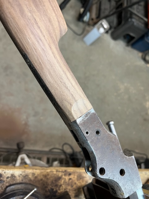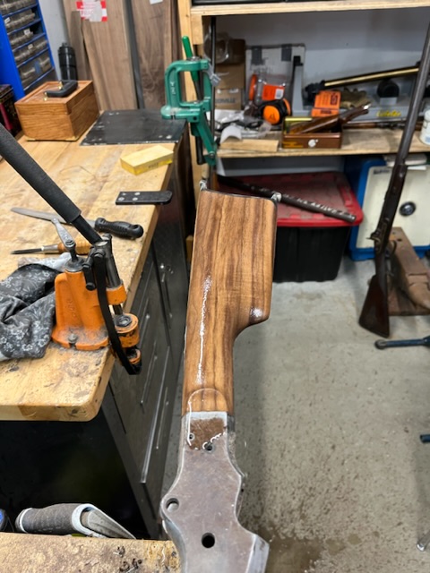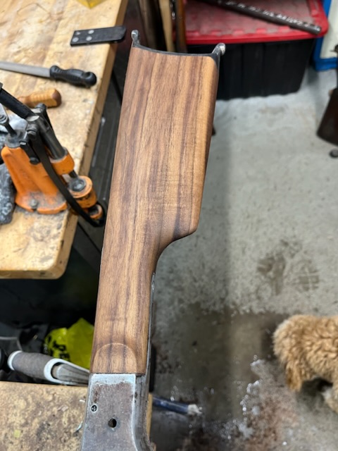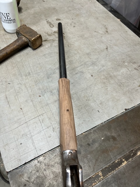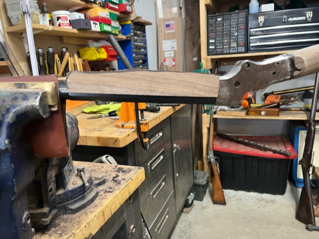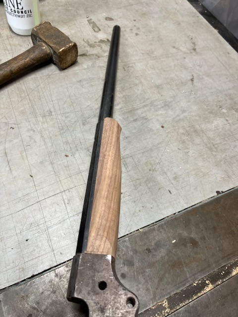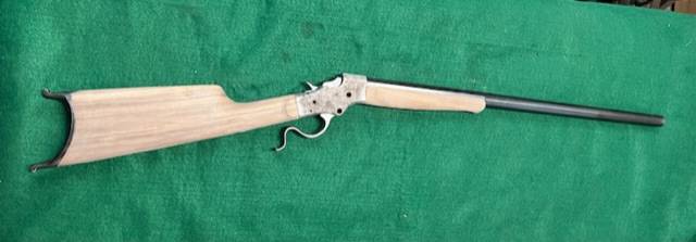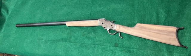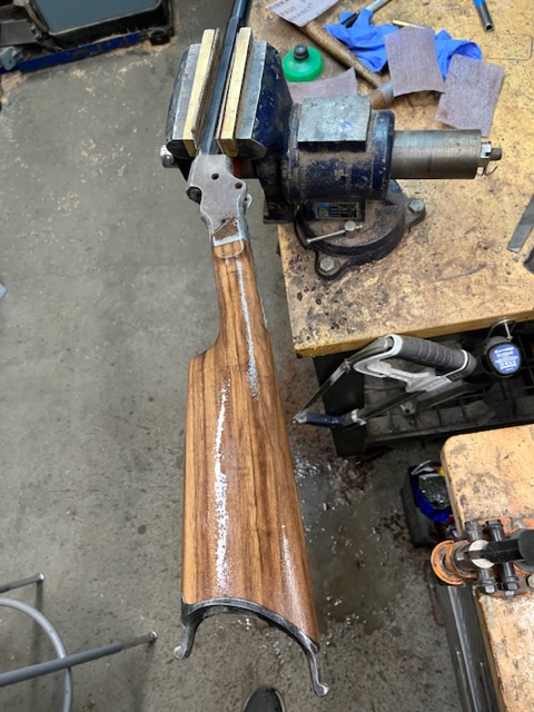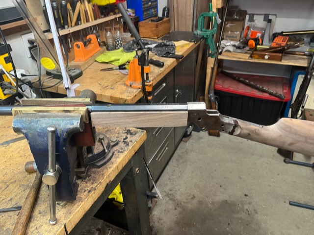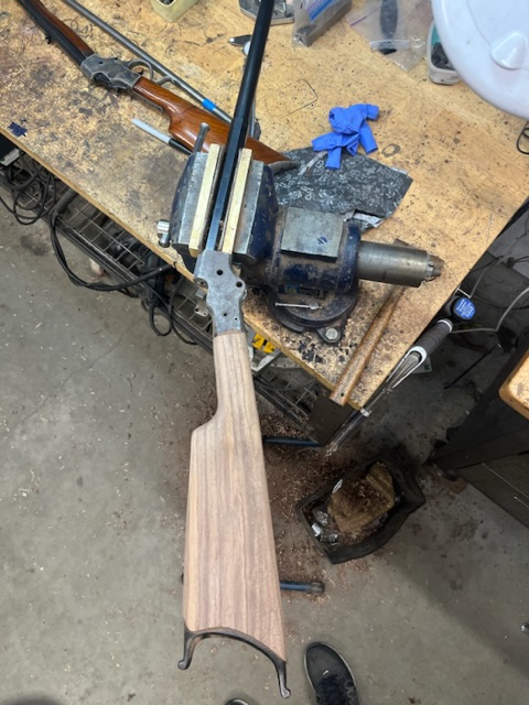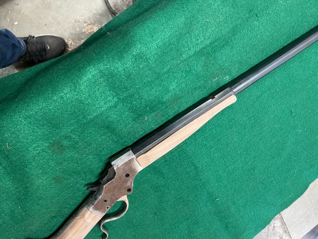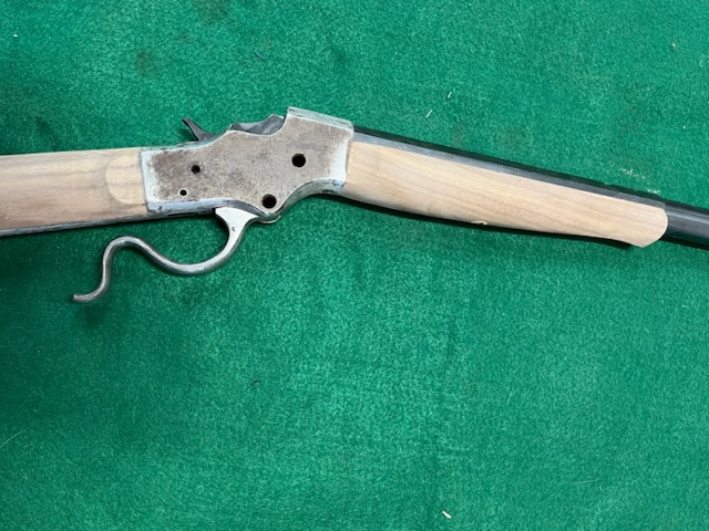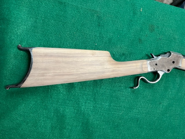A few years ago I bought a bunch of pieces to make a Stevens 44. The barrel is a #2 weight half octagon, it was a 25 rimfire, now it is lined in 22 LR. I picked up a Small Swiss Buttplate for a Stevens so I put it on the rifle. I made the stock from a piece of walnut with decent colour variation. I think it should look good when it has a nice oil finish on it.