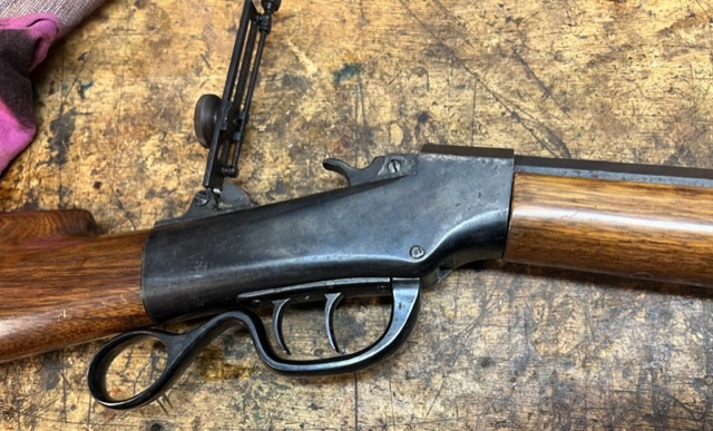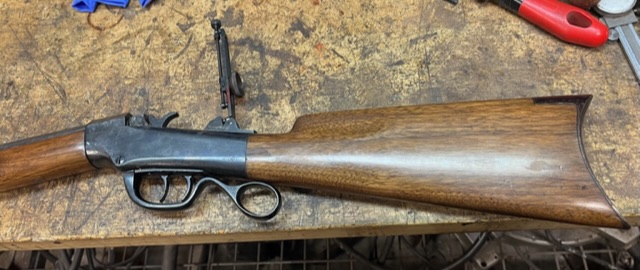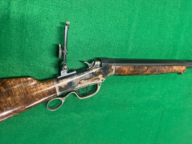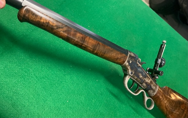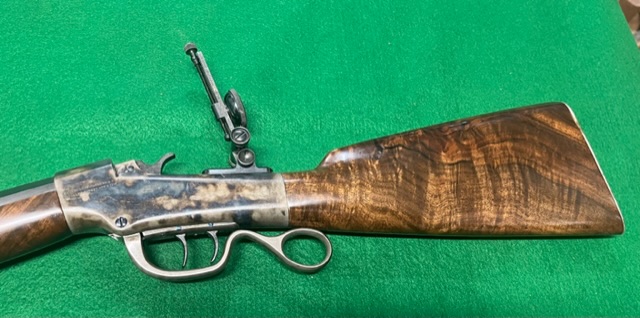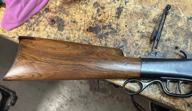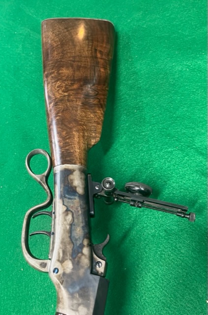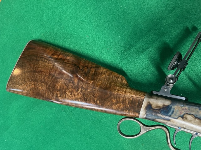 I just finished a Ballard in 38-55. It is from a Ken Briesen barrel blank, the action is a Ballard 1 3/4 iron frame (notice how the double set trigger plate sits below the action. I picked up a chunk of wood from a local gun shop. It already had another stock cut out of it but I was able to squeak a Ballard stock out of it. I probably have 50 coats of tung oil on the stock but it came along nicely. It was a pretty rough in some weird 30 cal (sleeved with an old military barrel)
