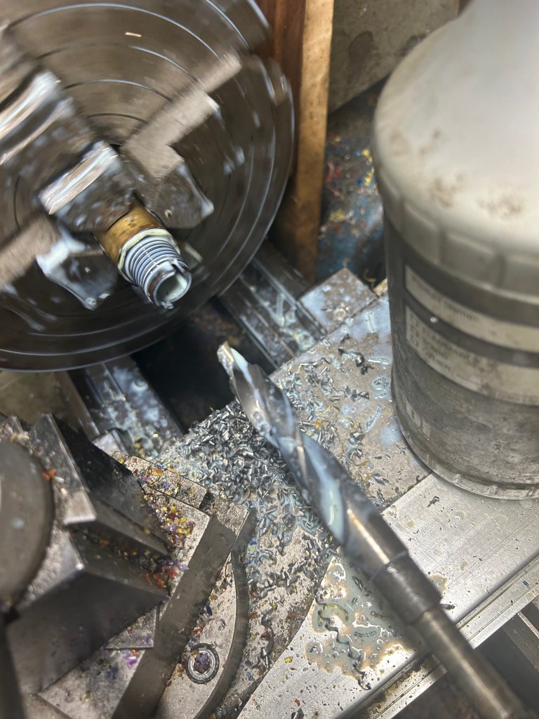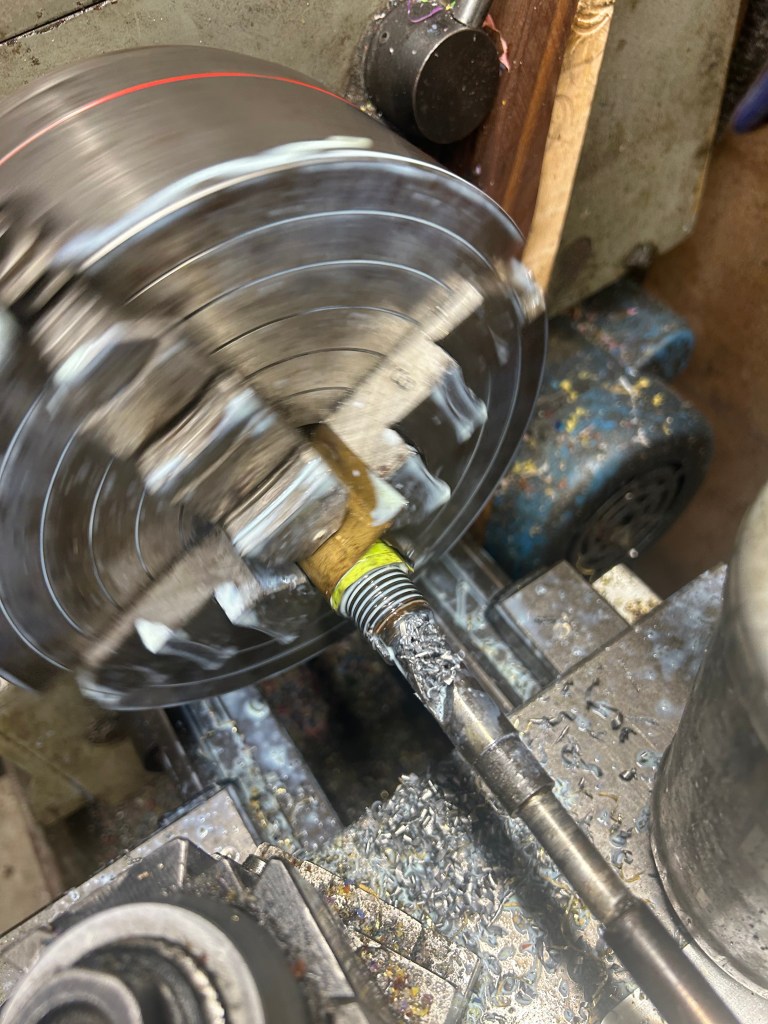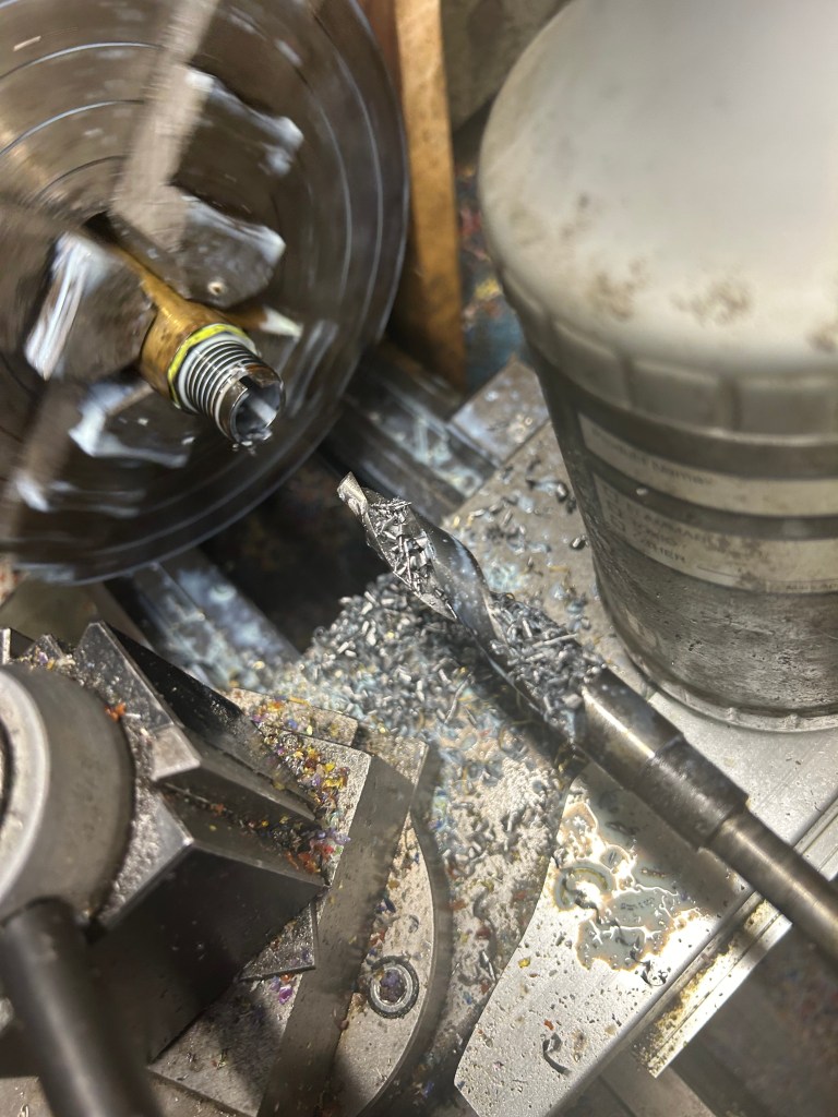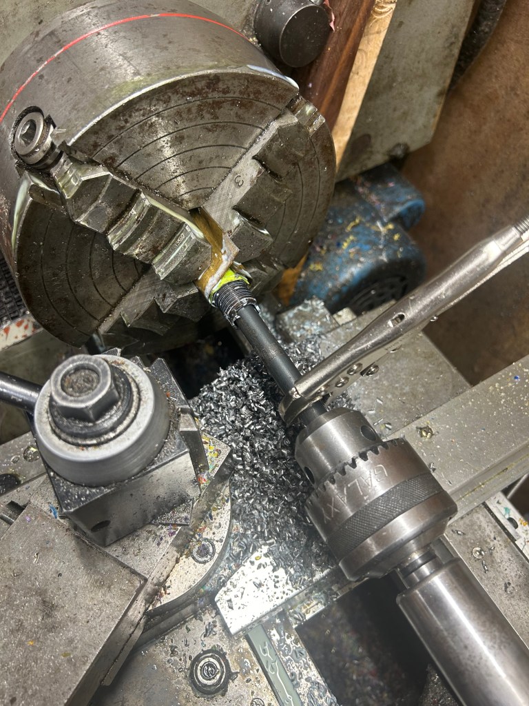 Today I bored a Marlin 32-40 barrel for a new liner. I bought the liner from Nine35.ca. The liner is a TJ liner in 9/16” dia. I ground a pilot on a 9/16” drill bit to fit into the old bore. I mount the barrel in a 4 jaw chuck and drill at slow speed with lots of water based cutting oil. I can only advance about 1/4” before clearing chips and spraying on more lube. It took me about 3 hours to drill this 26” barrel. I degreased inside the hole and the outside of the liner and glued it with slow curing epoxy. Tomorrow the glue will be dry so I can start chambering and crowning the barrel. I have to recut the dovetails on the front of the barrel for the sight and mag tube.