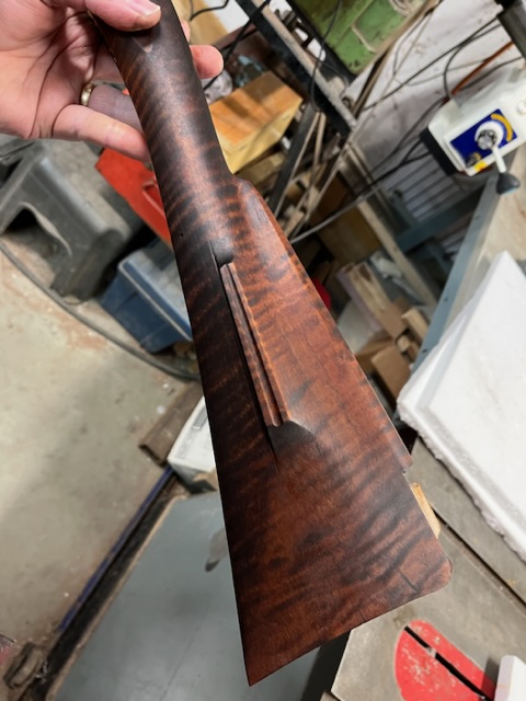During Christmas Break 2021 I built my second Jim Kibler Flintlock kit, a 58 Cal Colonial. It is an amazing quality kit and the rifle is a joy to shoot and hold. It has extra fancy maple, nicely swamped barrel, aquafortis stained, tung oil stock finish, rust blued and rubbed back to grey with Scotch Bright pad.